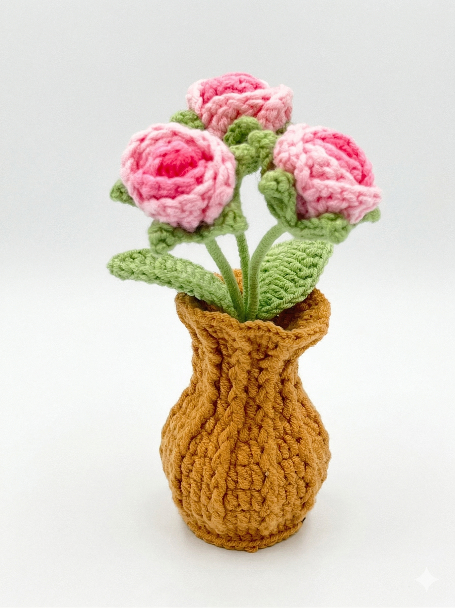 This beautiful, handmade crochet bouquet features three delicate pink roses nestled in a charming, honey-colored knitted vase. Finished with a "Handmade with Love" tag, these everlasting flowers make an ideal, maintenance-free gift for anniversaries, birthdays, or home decor.
