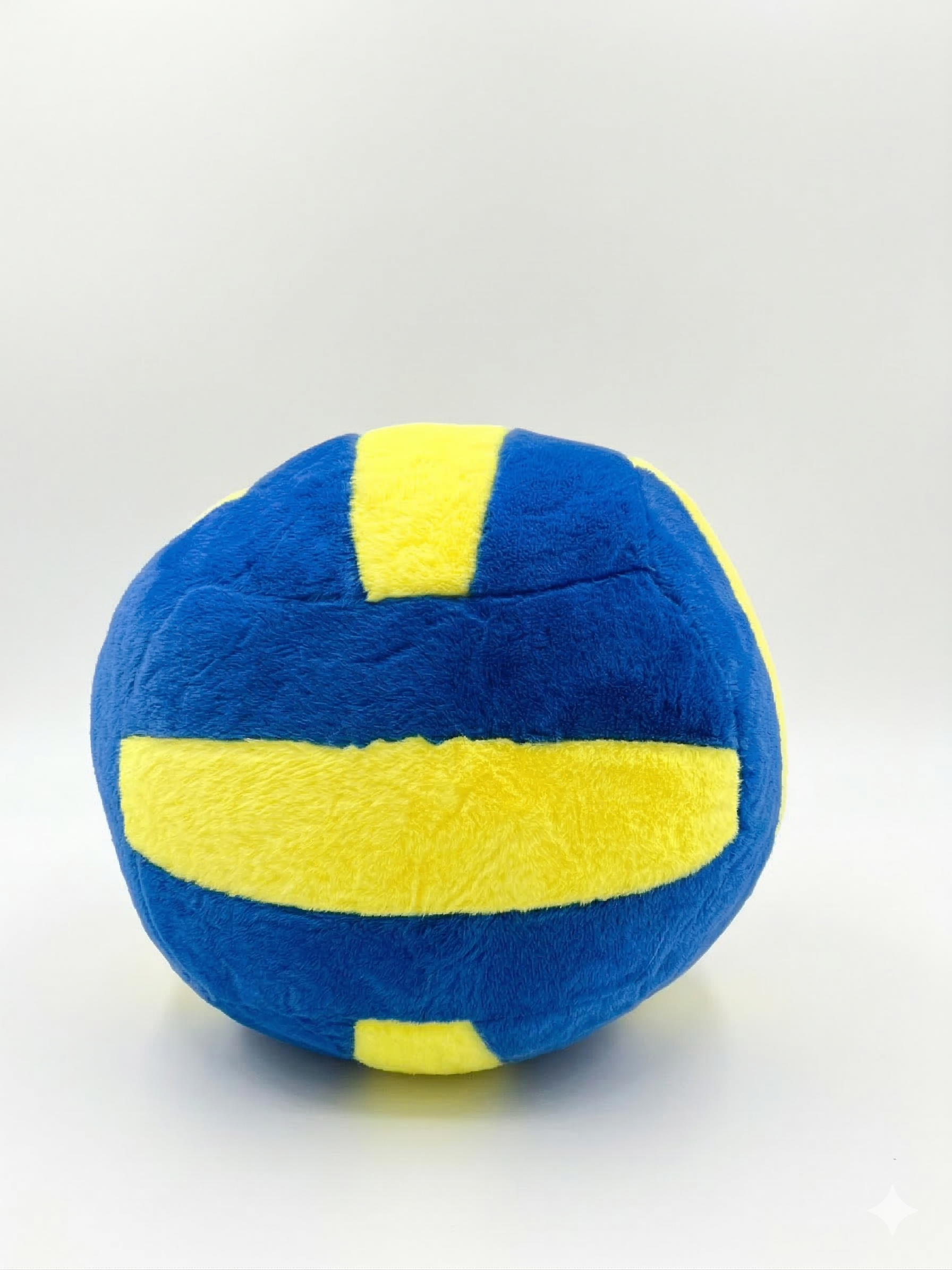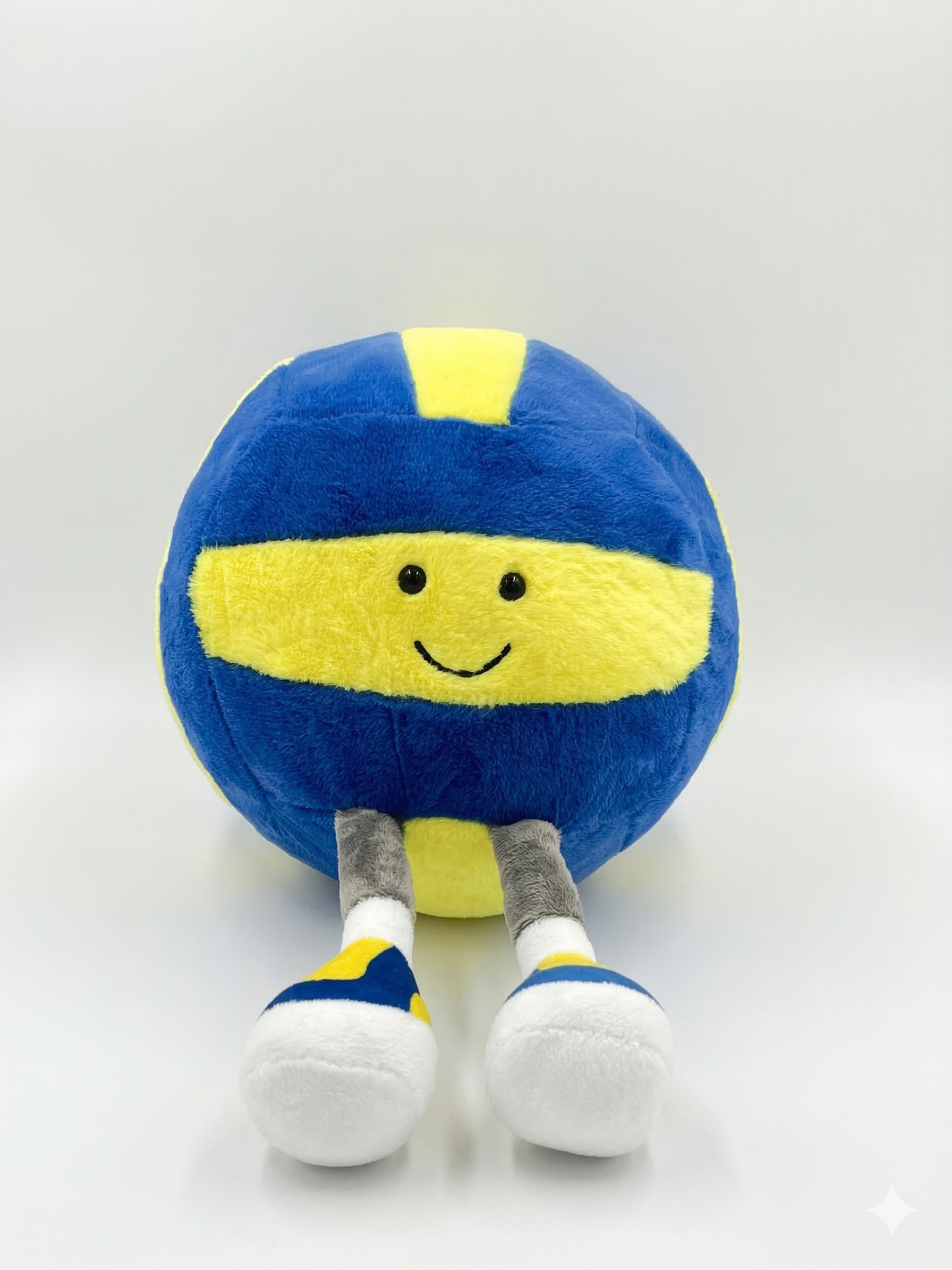 This ultra-soft plush volleyball features a cheerful embroidered smiley face and whimsical dangling legs in matching sneakers. With its vibrant blue and yellow faux-fur panels, it’s a cozy, high-quality companion perfect for sports fans, kids, or adding a playful touch to any room.